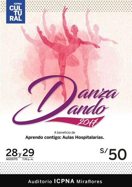 “DANZA DANDO 2017”. Como todos los años, cumpliendo con el objetivo de este festival benéfico, Eudanza y Rosie Schottland Ballet Clásico organizan este recital en el que presentarán a las mejores coreografías de las mejores compañías locales. Lugar: Auditorio ICPNA Miraflores (Av. Angamos Oeste 160). Hora: 7:30 p.m. Boletería: S/50.