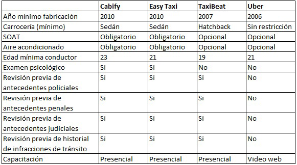 Sin embargo, en cuanto a medidas de seguridad, las cosas hoy son distintas entre las aplicaciones. De las 4 aplicaciones más utilizadas en Lima: Uber, TaxiBeat, Easy Taxi y Cabify, solo 3 de ellas revisan antecedentes de los conductores. Mientras que solamente Easy Taxi y Cabify también realizan exámenes psicológicos presenciales obligatorios.