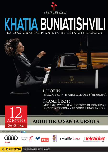 La Asociación Cultural Teresa Quesada (ACTQ) presentará en Lima a una de las pianistas mas aclamadas de nuestros días: Khatia Buniatishvili. La dos veces ganadora del Premio ECHO Klassik llegará para dar un gran recital con exquisitas obras de Chopin y Liszt, este sábado 12 de agosto a las 8:00 p.m. en el Auditorio Santa Úrsula (Av. Santo Toribio 150, San Isidro).