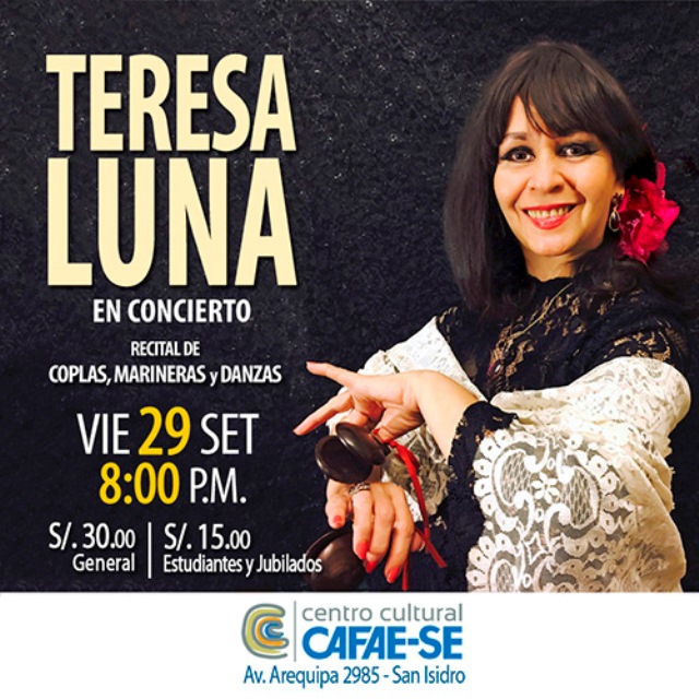 El Centro Cultural CAFAE-SE presenta a la intérprete Teresa Luna Revoredo, destacada artista multifacética que realiza conciertos de música flamenca, peruana e internacional por más de cuatro décadas. El concierto se realizará el viernes 29 de setiembre a las 8 de la noche en el Centro Cultural CAFAE-SE (Av. Arequipa 2985, San Isidro).