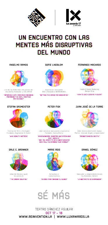 El Congreso de Ideas, Innovación y Creatividad cerrará su segundo día con la Ceremonia de Premiación de Lux Awards, a cargo de Juan Señor y con la presencia de los Jurados Sofie Lindblom, Fernando Machado, Gustavo Leme, Diego Medvedocky y Daniel Pérez Pallares, liderados por el Presidente Anselmo Ramos. Una vez entregados los premios, Reinvention y Lux Awards despedirán a sus conferencistas y asistentes con una gran fiesta en los exteriores del Teatro.