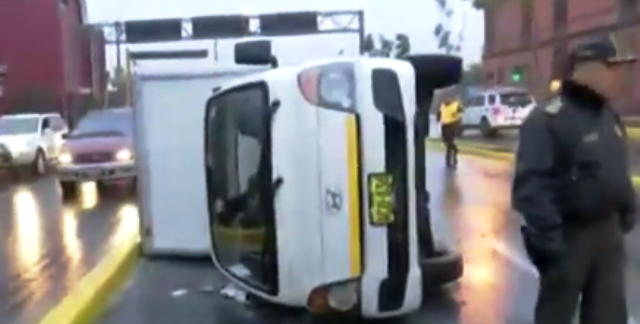 Una furgoneta se despistó, invadió el carril contrario y se volcó en la primera cuadra de la avenida Tacna, frente al Santuario de Santa Rosa, en el Centro de Lima.