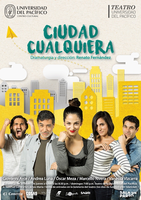Ciudad cualquiera, escrita y dirigida por Renato Fernández, es la cuarta obra para adultos de la temporada 2017 del Teatro de la Universidad del Pacífico. Esta obra obtuvo el premio especial del jurado del Festival de Teatro Sala de Parto 2015.