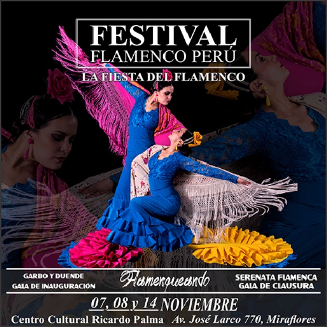 El Festival Flamenco Perú – La fiesta del flamenco, se realizará en el Centro Cultural Ricardo Palma a las 8 pm, los días 7, 8 y 14 de noviembre próximos. Serán tres días inolvidables con el toque, cante y baile de artistas consagrados junto a jóvenes promesas. Y este cartel de lujo se completará con invitados de Venezuela, Cuba y Rusia.