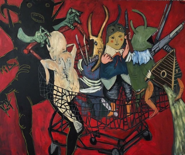 Un conjunto de obras ahonda en la psicología del terror y en la pérdida de la inocencia, esa que crece y nos acompaña desde la infancia poblada de muñecos, peluches, armas y el payaso siniestro. Otro conjunto se explaya en criaturas seductoras que lindan entre lo espeluznante y lo dulce, ahí están personajes como “Lobo” de Emilio Longhi, “Caperucita” de Sandra Murillo, el ET en “Rancho” de Christian Bernuy, o la niña ángel en el cuadro “Guitarrista ciego con ángel” de Enrique Polanco. Visiones que pasan de lo lúdico a lo siniestro, de lo siniestro a lo maravilloso.