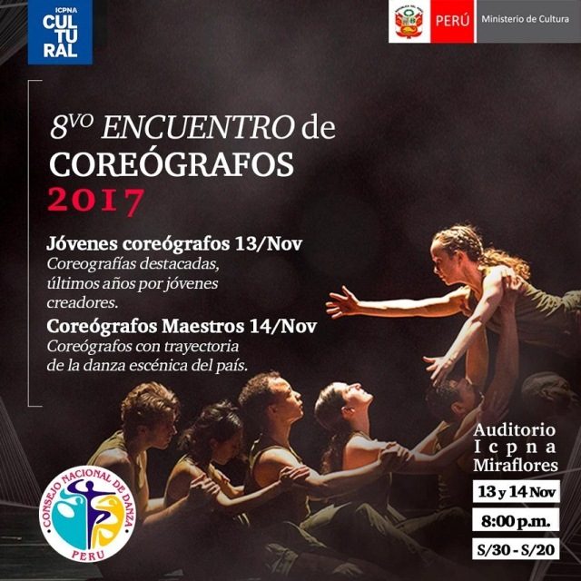 “OCTAVO ENCUENTRO DE COREÓGRAFOS”. Organizado por el Consejo Nacional de Danza-Perú, este encuentro estará puesto al servicio de cuerpos con entrenamiento en los diversos géneros de la danza, y dará al público una muestra de buen nivel profesional. El lunes 13, el encuentro abrirá con la demostración de los jóvenes coreógrafos en estilos como danza fusión y danza urbana. Por su parte, el martes 14, será el turno de los coreógrafos maestros (coreógrafos con trayectoria en la danza escénica del país). Lugar. Auditorio ICPNA Miraflores (Av. Angamos oeste 120). Hora: 8:00 p. m. Boletería: S/30 y S/20.