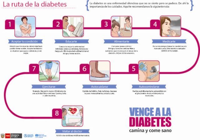 La diabetes es una enfermedad que se puede controlar, por ello, la campaña “Vence a la diabetes” liderada por la Organización Panamericana de la Salud y la Asociación de Comunicadores Sociales Calandria comparte la ruta de ocho pasos que todo paciente debe seguir para evitar todo tipo de riesgos: