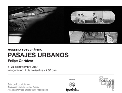 El director académico de las carreras de Diseño de Toulouse Lautrec Felipe Cortazar, presenta Pasajes Urbanos, muestra fotográfica producto de un proyecto académico de la década de los 80, conformada por 18 series de imágenes sobre el tema del transporte urbano. En ella hace uso de una contrastada escala tonal que nos remite al cotidiano padecer del transporte urbano de la ciudad de Lima.