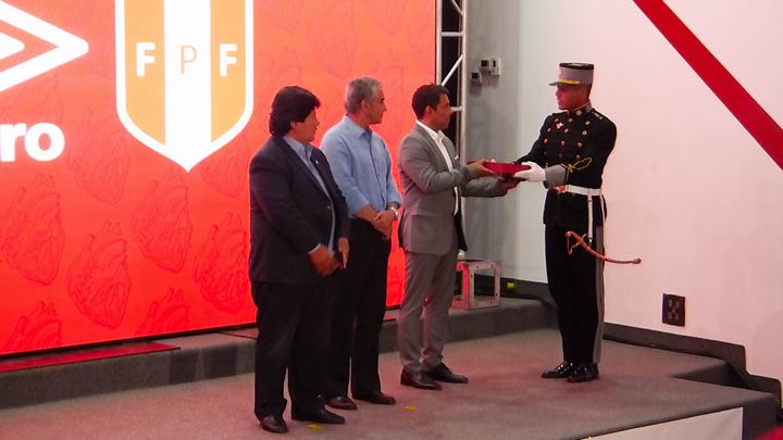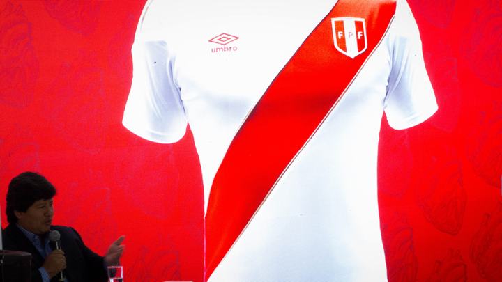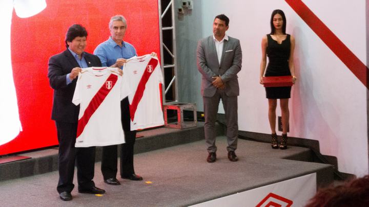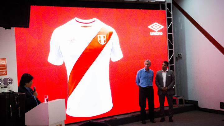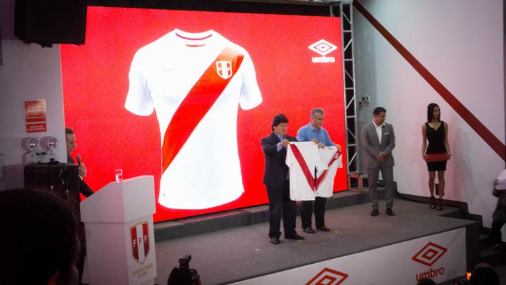 Durante la presentación oficial, el gerente de marca de Umbro, Johan Vela, hizo entrega de la tan preciada camiseta al presidente de la Federación Peruana de Fútbol, Edwin Oviedo.