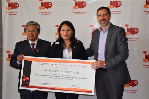 En la Categoría Investigación en Acuicultura, el primer puesto fue entregado a Shirley Terrones España, de la Universidad Nacional del Santa (Áncash), quien presentó la tesis: «Efecto de dietas con harina de ensilado biológico de residuos blandos de Argopectenpurpuratuscomo sustituto parcial de la harina de pescado en el crecimiento de Cryphiopscaementarius en co-cultivo con Oreochromisniloticus”. Ella fue asesorada por el docente Walter Reyes Ávalos.