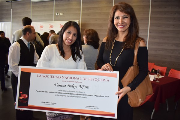 Durante la ceremonia de premiación, la vicepresidenta de la Sociedad Nacional de Pesquería (SNP), Adriana Giudice, señaló que,con esta iniciativa, el gremio pesquero fomenta la investigación científica para el desarrollo y conocimiento de este sector tan importante para la economía nacional.
