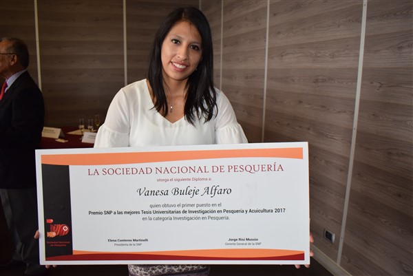 Durante la ceremonia de premiación, la vicepresidenta de la Sociedad Nacional de Pesquería (SNP), Adriana Giudice, señaló que,con esta iniciativa, el gremio pesquero fomenta la investigación científica para el desarrollo y conocimiento de este sector tan importante para la economía nacional.