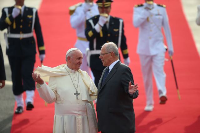 El Papa Francisco recibió la bienvenida al Perú del Presidente de la República, Pedro Pablo Kuczynski, en el Grupo Aéreo Número 8 del Callao, donde aterrizó el avión que trajo al Sumo Pontífice a territorio nacional.