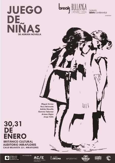 Break y Bullanga Compañía Teatral (España) presentarán, por solo dos funciones, la obra teatral JUEGO DE NIÑAS del dramaturgo y director español Adrián Novella. Las presentaciones se llevarán a cabo el martes 30 y el miércoles 31 de enero próximos a las 7:30PM. en el Auditorio Miraflores del Británico Cultural.