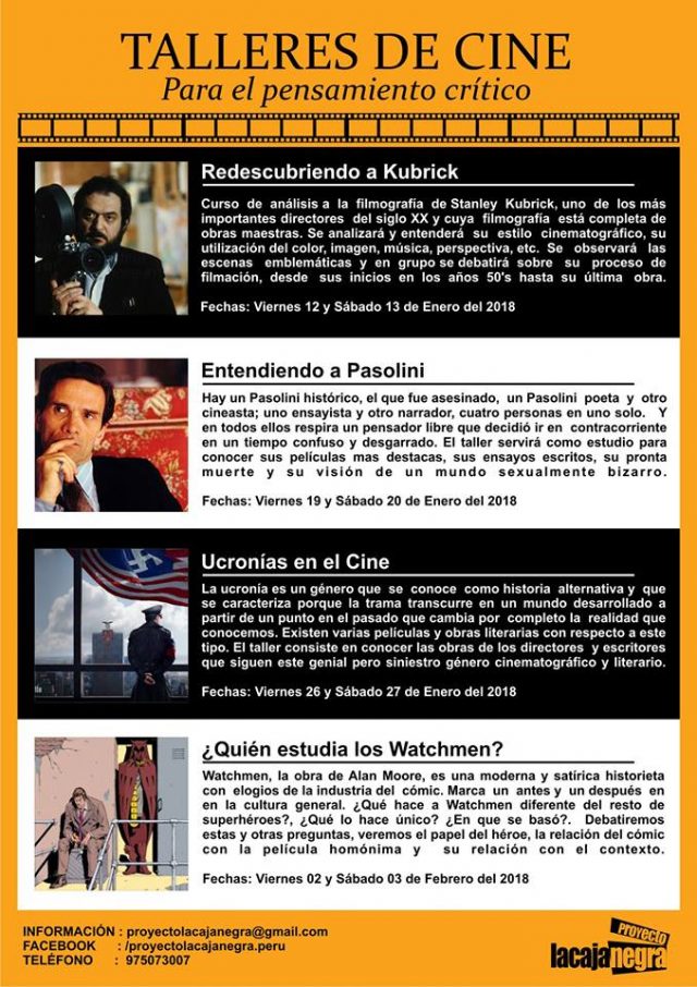 Se inició los talleres de cine para el pensamiento crítico. En cada taller se analizará y se aprenderá sobre el el tema escogido (director, género ó comic). Además se discutirá en grupo sobre los temas específicos que caracterizan cada workshop. Se observará escenas de películas y se realiza una serie de ejercicios visuales, como la interpretación, subjetividad y la argumentación, que permitirá al alumno conocer mejor el cine y desarrollar sus habilidades en el pensamiento crítico cinematográfico.