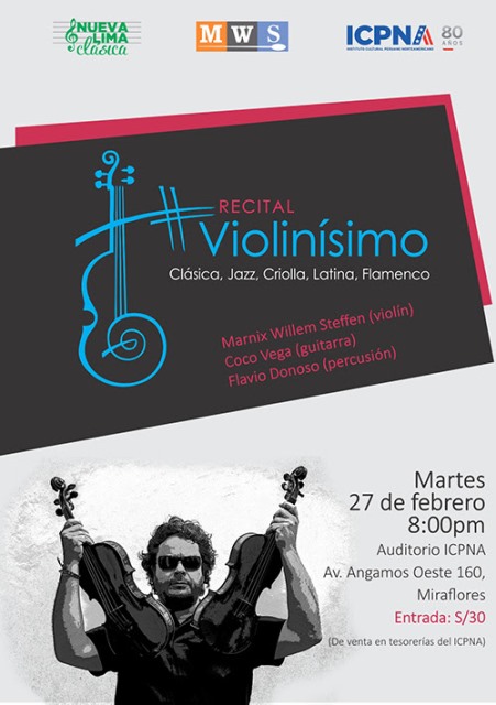 #VIOLINÍSIMO es una iniciativa del violinista holandés Marnix Willem Steffen, quien nos ofrece conciertos con el violín como protagonista. Son conciertos fusión para todo público, con una mezcla de varios estilos musicales como clásica, jazz, pop, andina y latina. Siempre con la participación de los mejores músicos de Lima.
