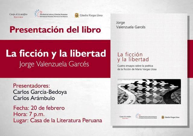 El 20 de febrero del presente mes se llevará a cabo en la Casa de la Literatura la presentación del libro «La ficción y la libertad» de Jorge Valenzuela, doctor de la Universidad Nacional Mayor de San Marcos. Cuatro ensayos sobre la poética de la ficción de Mario Vargas LLosa.
