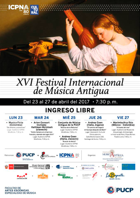 La décimo sexta edición del Festival Internacional de Música Antigua, organizado por el Conjunto de Música Antigua de la PUCP, conjunto en residencia de la Especialidad de Música de la Facultad de Artes de la PUCP, presenta destacadas agrupaciones y solistas extranjeros y nacionales que nos transmitirán las sonoridades del Barroco europeo y virreinal.