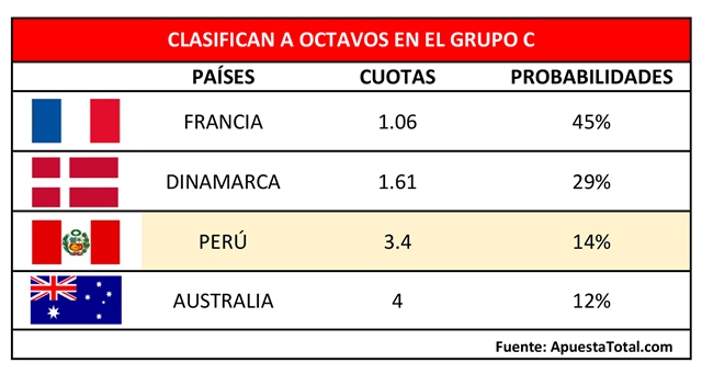 “Hoy las probabilidades de Perú de pasar a octavos son del 14%. Nos superan Francia con una probabilidad del 45% y Dinamarca con 29%. Tenemos ventaja sobre Australia con 12%”, revela Antonio Salord, Gerente de Producto de ApuestaTotal.com. Las casas de apuestas calculan las probabilidades de cada selección en función a las cuotas; a su vez las cuotas se calculan en función a diversos factores como: la posición del país en el ranking FIFA, los últimos resultados logrados, jugadores estrella habilitados para el encuentro, entre otros. Lógicamente, a menor posibilidad tenemos una cuota más alta.
