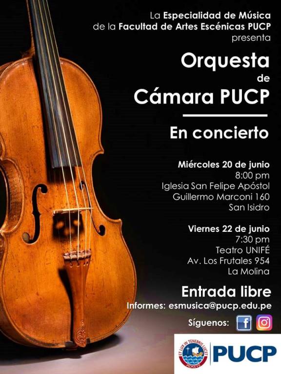 La Orquesta de Cámara de la Especialidad de Música de la PUCP, dirigida por la reconocida violinista Elmira Pouroundjan, y compuesta por estudiantes de la sección clásica de la Especialidad de Música de la Facultad de Artes Escénicas ofrecerá dos conciertos los días miércoles 20 de junio a las 8:00p.m. en la Iglesia San Felipe Apóstol (Calle Guillermo Marconi 160 – San Isidro) y el viernes 22 de junio a las 7:30pm en el Teatro UNIFÉ (Av. Los Frutales 954 – La Molina). En ambas ocasiones participará también la destacada soprano Jacqueline Terry, profesora también de la mencionada casa de estudios. El ingreso a ambos concierto es libre.