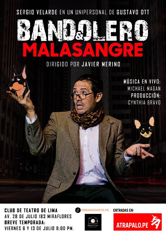 l destacado dramaturgo venezolano Gustavo Ott escribió un delirante monólogo a comienzos de siglo, que se presentará en dos únicas funciones: BANDOLERO & MALASANGRE, dirigida por Javier Merino, con la producción de Cynthia Bravo, y la actuación de Sergio Velarde. El espectáculo se presentará los días viernes 6 y 13 de julio a las 8:00 pm. en el Club de Teatro de Lima.