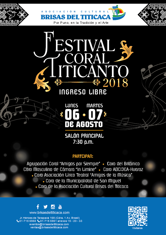 El Coro de la A.C. Brisas del Titicaca organiza el festival “Titicanto 2018”. Esta edición tiene un marcado carácter nacional, ya que contará con la participación de destacadas agrupaciones que presentarán desde “Cholitas Puneñas” hasta “Somebody to Love”, en una muestra de diversidad, amistad y música que será del agrado del público asistente.
