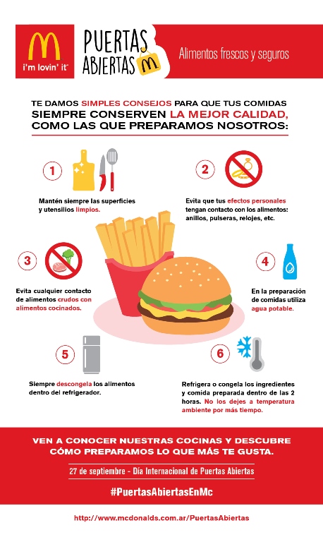 Desde la primera edición de “Puertas Abiertas” en 2014, más de ocho millones de personas en toda la región fueron recibidos en las cocinas de McDonald’s y vivieron una experiencia más allá del mostrador. Durante el recorrido de 20 minutos, las personas son testigos de las medidas que se llevan a cabo diariamente para producir las hamburguesas más famosas. “Puertas Abiertas” se encuentra vigente todo el año en todos los restaurantes de América Latina y el Caribe en donde opera la marca.