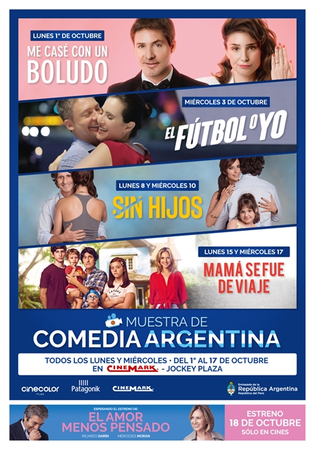 SIN HIJOS, EL FUTBOL O YO, ME CASÉ CON UN BOLUDO Y MAMÁ SE FUE DE VIAJE (película argentina más taquillera de la historia peruana con más de 250,000 espectadores) serán presentadas en Cinemark Jockey Plaza desde este 1ero al 17 de octubre.