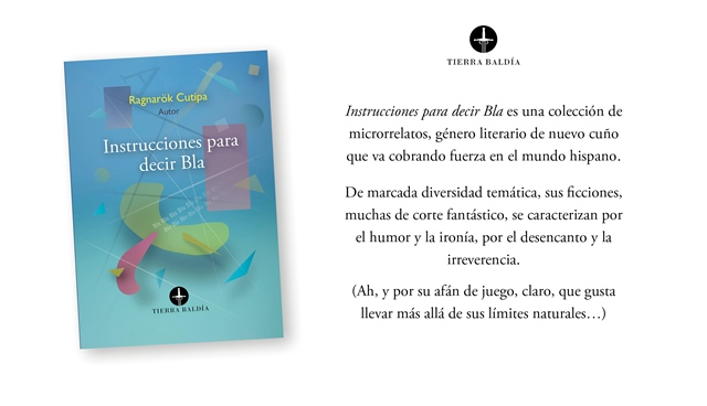 El sábado 22 de septiembre, a las 8 p.m., en el local del Centro Cultural Tierra Baldía (avenida El Ejército 847, Miraflores) se presentará el libro Instrucciones para decir bla de Ragnarök Cutipa Poyentimari, con los comentarios de Jorge Wiesse, Jorge Valenzuela y José Donayre.