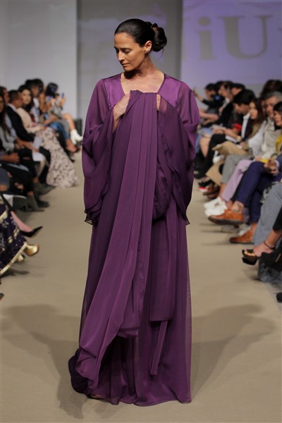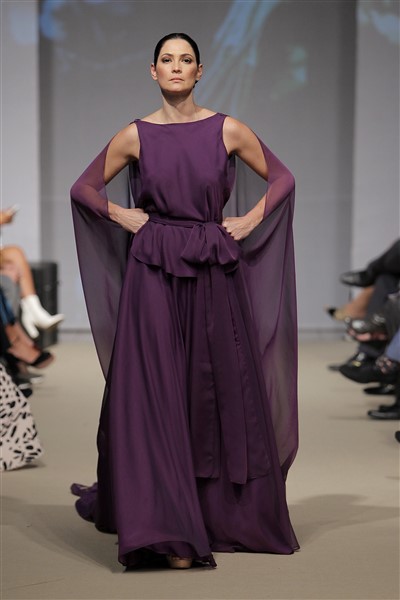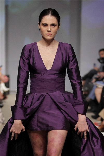 Los vestidos que lucieron las modelos fueron confeccionados en tonos morados y violetas- color símbolo de la lucha contra la violencia a la mujer-, con diseños de Ángeles Schlegel.