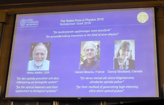 Un estadounidense, un francés y una canadiense fueron galardonados el martes con el premio Nobel de Física por el desarrollo de herramientas de óptica láser utilizadas en la industria y en la medicina.