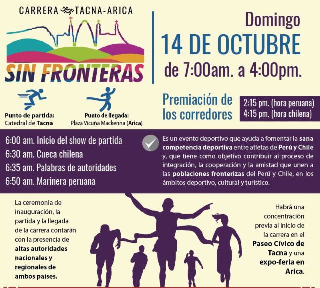 Con una Marinera peruana y una Cueca chilena frente a la Catedral de Tacna, se dará inicio mañana domingo a la primera maratón de 60 kilómetros, denominada «Carrera sin Fronteras», que unirá las ciudades de Tacna y Arica, informó el Ministerio de Relaciones Exteriores.
