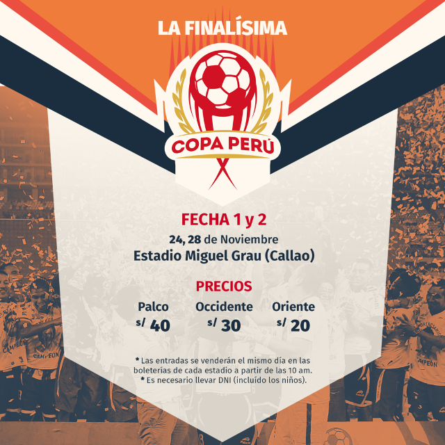 LIMA, 23 Nov. 18 / 12:20 p.m. (FPF).- La Federación Peruana de Fútbol a través de la Comisión Nacional de Fútbol Aficionado hace pública la lista de precios y forma de venta de las entradas a la Finalísima de la Copa Perú, para las fechas 1 y 2 que se llevarán a cabo en el Estadio Miguel Grau – Callao. La venta de los tickets se realizarán los mismos días de los partidos en las ventanilla en el Estadio, a partir de las 10:00 horas. A continuación la lista de precios: