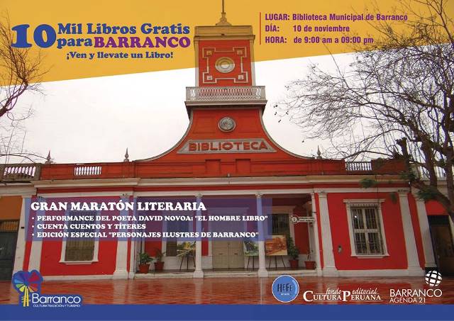 Como celebración por el Día Mundial de la Biblioteca, el Fondo Editorial Cultura Peruana con el apoyo de la Sub Gerencia de Turismo Educación y Cultura de la Municipalidad de Barranco, obsequiará a toda la gran comunidad peruana “DIEZ MIL LIBROS”, más de 200 títulos que incluyen autores peruanos contemporáneos y universales, en una gran maratón literaria de doce horas continuas de gratuita difusión literaria, que se llevará a cabo el próximo sábado 10 de noviembre en el frontis de la Biblioteca Municipal de Barranco a partir de las nueve de la mañana.