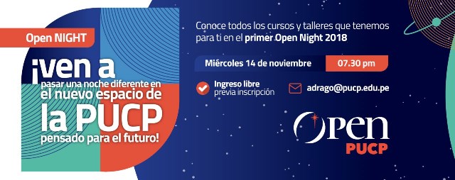 El 14 de noviembre a las 7:30 pm., OpenPUCP realizará el primer Open Night, evento en el cual se podrán conocer las instalaciones, participar en talleres, charlas y clases tipo, entre otras actividades. Para participar solo deben de inscribirse en el siguiente link: