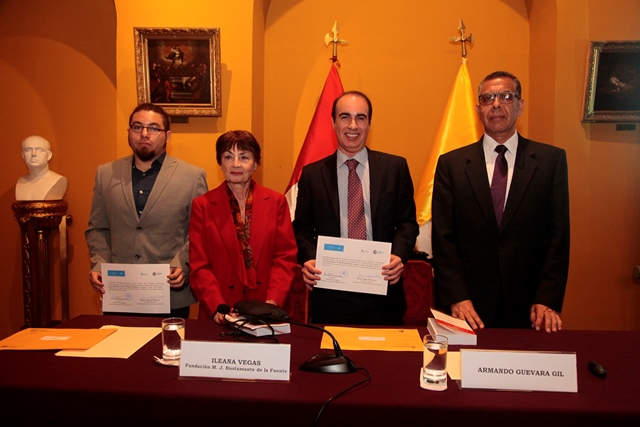 Abraham Samuel Abad Carrasco (ganador de la beca de licenciatura) Ileana Vegas de Cáceres de la Fundación Bustamante, José Ignacio Peña de Cárdenas (ganador de la beca de maestría) y el Dr. Armando Guevara Gil, Director del Instituto Riva Agüero.