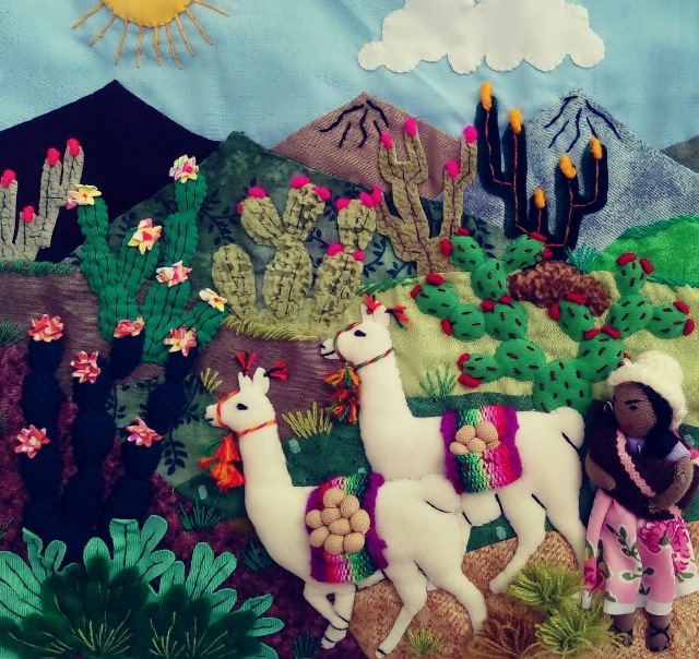 El material trabajado cuenta la historia de la artista así como la representación de paisajes peruanos y sus costumbres.