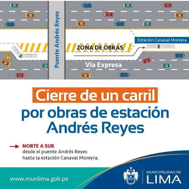 Los buses que circulan de norte a sur saldrán de la vía exclusiva e ingresarán a la pista auxiliar de la Vía Expresa, metros antes de llegar al puente Andrés Reyes, y retomarán su recorrido habitual a la altura de la estación Canaval Moreyra. Este desvío parcial de la ruta del Metropolitano se ejecutará por un plazo de 10 días.