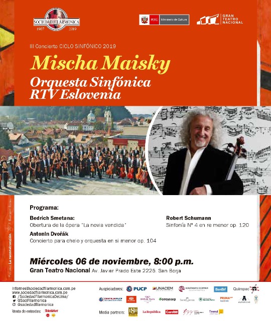 Aclamado por el público y la crítica como uno de los mejores violonchelistas del mundo, Mischa Miasky se presentará este miércoles 6 de noviembre a las 8:00 p.m. en el Gran Teatro Nacional junto a la Orquesta Sinfónica RTV de Eslovenia, en lo que será el tercer concierto del Ciclo Sinfónico 2019 de la Sociedad Filarmónica de Lima.