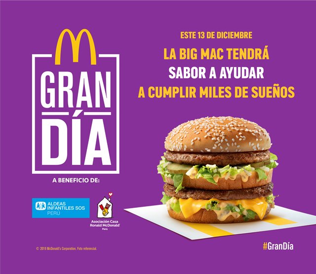 Lima, 27 de noviembre 2019.- Con el objetivo de recaudar fondos a favor de los niños de la Asociación Casa Ronald McDonald y los jóvenes de Aldeas Infantiles SOS Perú, este 13 de diciembre se celebra la tercera edición del “Gran Día”, una jornada solidaria que destinará el 100 % de las ventas de la Big Mac a dichas asociaciones.