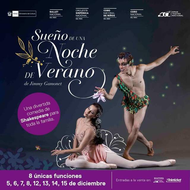 El Ministerio de Cultura de Perú presentará el espectáculo familiar “Sueño de una noche de verano”, producción que reunirá en el mismo escenario al Ballet Nacional, la Orquesta Sinfónica Nacional, el Coro Nacional y el Coro Nacional de Niños. Las funciones se realizarán los días, 5, 6, 7, 8 12, 13, 14 y 15 de diciembre, a las 8:00 de la noche (domingos 5:30 p.m.), en el Gran Teatro Nacional.