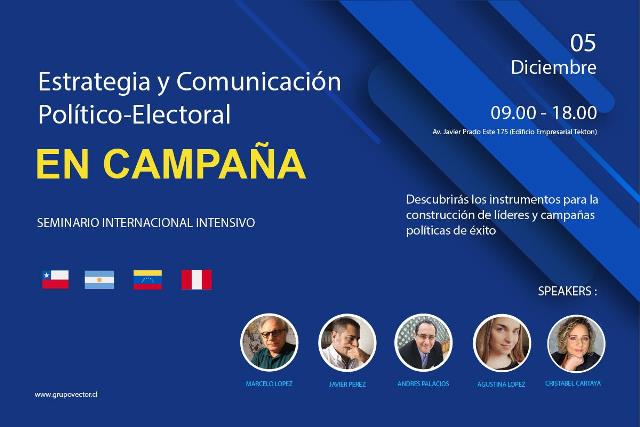 Reconocidos expertos internacionales provenientes de Chile, Argentina y Venezuela llegarán al Perú para participar del seminario “Estrategia y Comunicación Político-Electoral” dirigido a los candidatos congresales y referentes políticos, que tendrá lugar el próximo 05 de diciembre en el centro empresarial Tekton ubicado en Av. Javier Prado Este 175, oficina 1403, San Isidro.