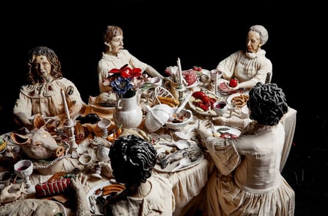 La primera vez que Vaçide Erda Zimić construyó una cena familiar, lo hizo en tela, y todos los personajes estaban en buenos términos. Esta vez, todo es de cerámica y puede romperse. La abuela, la madre y las tías de la artista, además de todo lo que implica un evento de este tipo (comida, vajilla, cucarachas y pretzels) fue esculpido a tamaño casi natural. Una forma de llevar al extremo el proceso de planear una cena: crearla en su totalidad.