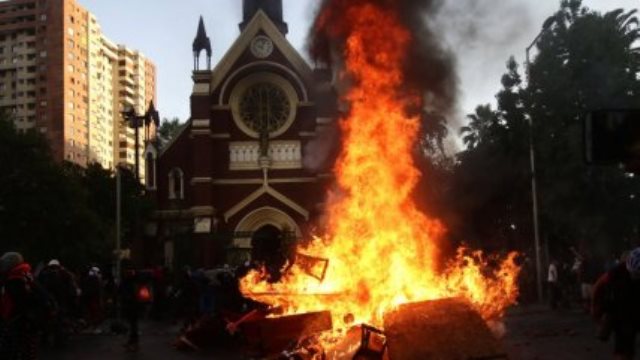 Ubicada en las cercanías de la Plaza Italia de Santiago, epicentro de la mayoría de protestas que estallaron en octubre del año pasado, la iglesia San Francisco de Borja comenzó a arder después de que fuera atacada por un grupo de encapuchados, afirmaron testigos.