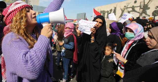 Inusitado en un país patriarcal y machista, las iraquíes han estado presentes en las manifestaciones desde el primer día. Aunque normalmente permanecen en la retaguardia de los enfrentamientos, entre las que prestan asistencia sanitaria ha habido alguna muerta y varias heridas por el impacto de los botes de humo que disparan las fuerzas de seguridad. No obstante, era la primera vez que las mujeres convocaban una marcha específica.