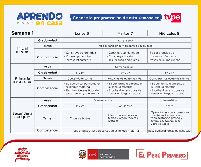 Los horarios programados para la difusión, así como la información técnica correspondiente, están en el link www.aprendoencasa.pe/. La educación a distancia está dirigida a estudiantes de colegios públicos, pero también pueden sumarse aquellos de escuelas privadas.