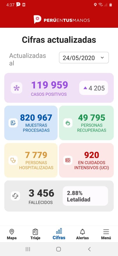 El Ministerio de Salud (Minsa) informó que hasta las 00:00 horas de hoy, 24 de Mayo, se contabilizaron 119.959 Casos de personas infectadas (4,205 más) y los Fallecidos aumentaron a 3,456 (83 más) por el nuevo Coronavirus Covid-19.
