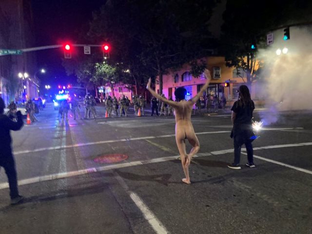 En un momento los oficiales lanzaron gases pimienta frente a ella y otro manifestante se colocó con un escudo delante de la mujer desnuda en un afán de protegerla. Pero ella se apartó al poco y volvió a la calle. Su condición desnuda, a la intemperie, con enorme vulnerabilidad y encarando a agentes federales que a lo largo de esa y otras noches habían estado realizando agresivas y controversiales acciones para dispersar a los manifestantes, incluso con las tácticas consideradas ilegales por las autoridades estatales, fue su poderosa, pacífica e impactante arma.