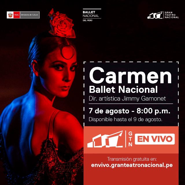 El Ministerio de Cultura pone a disposición del público el célebre espectáculo de danza Carmen, en versión del coreógrafo peruano Jimmy Gamonet, con emisiones gratuitas los días 7, 8 y 9 de agosto a través de la plataforma web del Gran Teatro Nacional: GTN En Vivo.