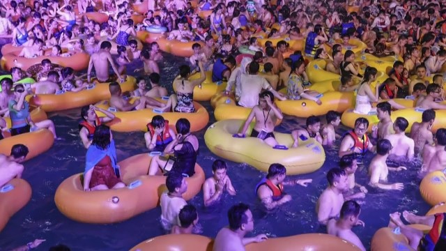 Durante el fin de semana, el parque acuático Wuhan Maya Beach se llenó de asistentes en trajes de baño agrupados hombro con hombro, moviéndose al ritmo de la música mientras se refrescaban en el agua hasta las caderas; otros se relajaron en tubos de goma inflables que llenaron la piscina hasta el borde, con poco espacio para flotar.